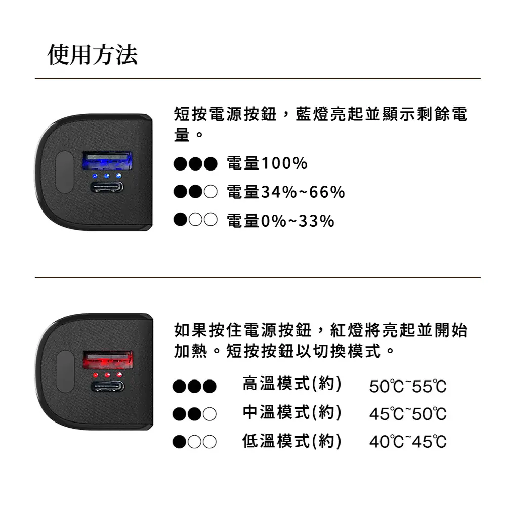 可當暖手寶使用,也可作為行動電源功能即時幫手機補充電量